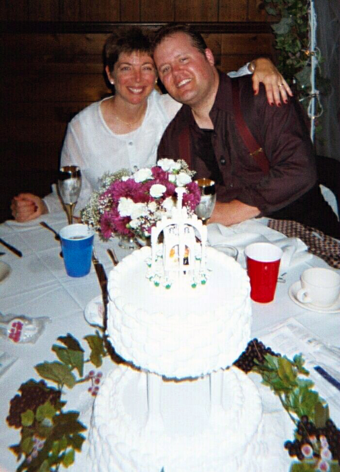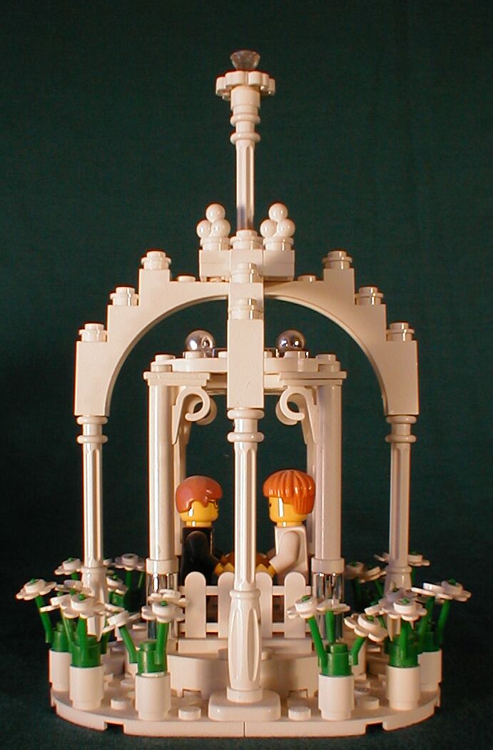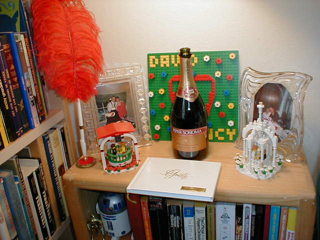 How do you know when she's the one? When she thinks it's a totally cool idea to have the bride & groom statues on the top of your wedding cake made out of Lego! Nancy and I were married on May 1st, 2002 at San Francisco City Hall. As our nuptials and reception grew near, we were deeply entrenched in planning out all the little details. I wondered what my lovely bride-to-be's reaction might be when I suggested ABS as the topping to our wedding cake, but she loved the idea. We were planning to have two receptions because most of her family is in New Jersey while mine resides in California, so we decided to have two different toppers for each cake.