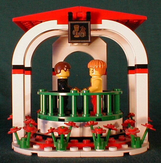 I designed the one for the California reception, which she approved immediately, and we collaborated on the one for the reception in New Jersey. The color scheme for the California reception was red, black, and gold, to reflect the invitations we'd sent. I built the topper very quickly, and was really glad that I'd bought the rereleased Guarded Inn because the wine goblet and grapes flag was the perfect rooftop adornment. For the New Jersey reception, Nancy wanted a more traditional all-white design, and with a little help from Belville, we made it happen!